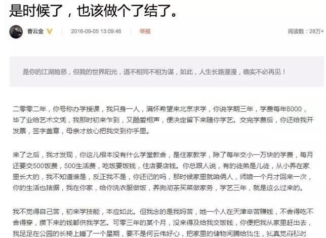 仅四天后,曹云金发布长达六千字的回忆文章,瞬间引爆网络。文中提到,自己每年需缴纳一万元学费,但郭德纲对外坚称从未收费。